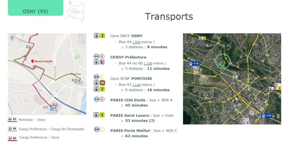 Parc d'activités nouvelle génération divisible proposé à la location, à Osny, Au coeur du parc d'activités les Beaux Soleils, idéal pour une société recherchant des locaux mixtes : bureaux/activités, Jardin paysager Contrôle d'accès Accès camions Accès camionnettes Accès poids lourds ERP Ventilation double-flux Locaux neufs Parties communes de très bon standing Faux-plafonds Pré-câblage informatique et téléphonique Interphone Interphone Ventilation double-flux Faux-plafonds Pré-câblage informatique et téléphonique Espace(s) ouvert(s) Stores électriques Accès camionnettes de plain-pied Cour de déchargement Bureaux aménagés, non cloisonnés Portail automatique Accès livraison camionnette Charpente : béton Hauteur la plus haute : 7,50 m Sol : dalle industrielle Sol : dalle béton Couverture : bac acier . Accès poids lourds . Aire de chargement . Aire de manoeuvre . Interphone . Sanitaires privatifs . Charge au sol : 3 tonnes / m² . Porte sectionnelle de plain pied : . Dimensions porte : 4 (H) x 4 (L) m Surface RDC : 5958 m² Haut. libre max. ss poutre : 7,5 m Résistance sol : 3 T/m² Ossature : Béton Murs périmétriques : Parpaing Couverture : Bac acier Situation/Transports : Bus Avenue des Arpents (Ligne 60, Ligne 44, Ligne 43) Dépot de garantie : 3 mois de loyer HT/HC