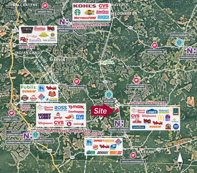 Espace de vente au détail et de bureau/médical à partir de 1 500 SF disponibles pour une livraison à la fin de 2024 Situé le long du chemin Providence, dans l'une des collectivités à la croissance la plus rapide de South Charlotte La propriété a un accès partagé à l'intersection signalisée de la promenade Kensington et du chemin Providence S. Adjacent au centre-ville actuel de Cureton, un centre commercial entièrement développé, ancré par Harris Teeter Signalisation du bâtiment disponible