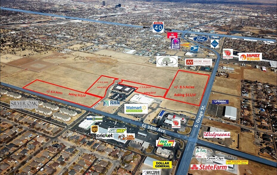 Vente de détail et terrains multifamiliaux - coin nord-ouest d'Osage et 34e. Adjacent au Walmart Neighbourhood Market, Toot'n Totum et Regence Health Network. Les commerces de détail environnants comprennent Walgreens, M & R Package Store, First United Bank, NWTX Urgent Care, Pak a Sak, Subway et plus encore. Façade Osage (8,09 acres) - 10 $/pc 34e façade sud-est (1,38 acre) - 12 $/pc. Terrain arrière à l'arrière (15,2 acres) - 4 $/pc. Les lots peuvent être divisés en fonction des besoins de l'acheteur. Le prix par pied carré peut changer s'il est divisé. Situé dans une zone en développement avec un bon mélange de logements résidentiels, multifamiliaux, industriels et commerciaux.