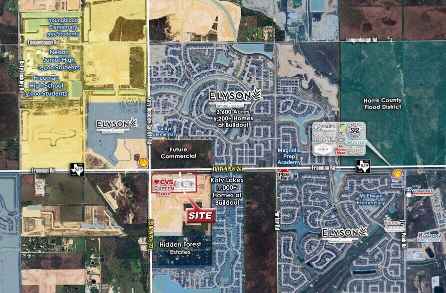 Le développement de 4,38 acres, stratégiquement situé à l'angle sud-est des chemins FM-529/Freeman et Katy-Hockley Cut-Off, promet d'être un ajout important à la région. Cet emplacement privilégié bénéficiera énormément de la proximité de nouveaux établissements d'enseignement, y compris une école secondaire, une école secondaire et une école primaire, qui devraient tous ouvrir à l'automne 2024, à environ un mile du site. De plus, le développement est situé directement en face de la vaste communauté planifiée d'Elyson de 3 600 acres, qui comprendra plus de 6 200 maisons une fois achevées, ce qui renforcera encore la croissance et l'attrait de la région.