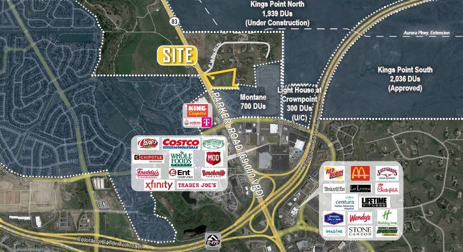 Le plan directeur de la Ville de Parker appuie les services résidentiels à usage mixte Juste au nord du E-470 sur le chemin Parker Adjacent au centre d'ancrage King Soopers Un pâté de maisons du centre ancré à Costco, y compris Gander Mountain et Boondocks Situé dans l'extrémité nord du marché Parker en croissance rapide Plus de 550 pieds de façade sur Parker Road /State Highway 83 Adjacent au projet d'appartements Vantage Point avec 900 unités multifamiliales en construction Excellent emplacement pour une grande variété d'applications commerciales ou mixtes