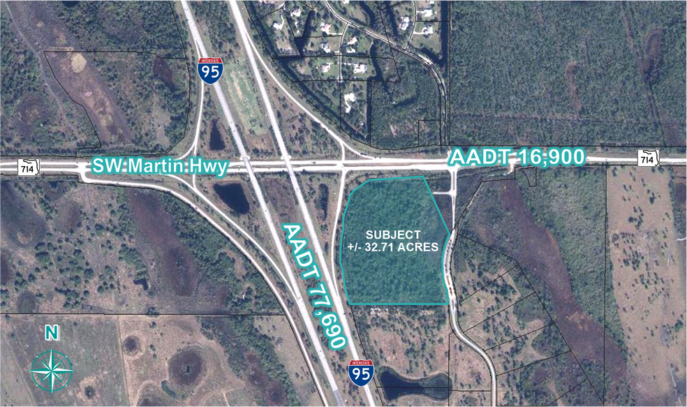 Le site de développement commercial de +/- 32,71 acres est excellent le long de la I-95, à la sortie 110, dans le sud-est de la Floride. Le zonage permet une variété d'utilisations commerciales, y compris les stations-service/dépanneurs, les restaurants, les hôtels et d'autres utilisations commerciales et de détail. Excellent emplacement et l'un des derniers sites commerciaux restants le long du corridor de la côte au trésor. Beaucoup de nouveaux logements sont prévus à l'est, ainsi que de grands projets industriels prévus à l'est et à l'ouest. Corridor de navettage lourd le long de la I-95 et vers Palm City/Stuart. Martin Hwy est un lien principal avec Indiantown et Okeechobee.