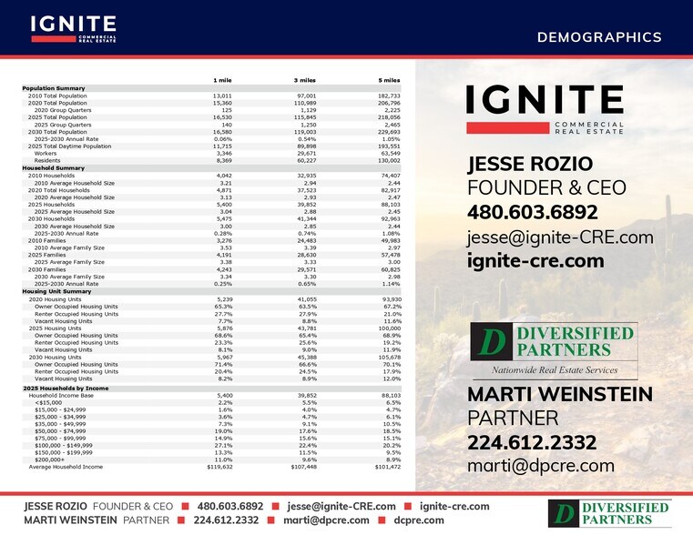 • Situé à seulement quelques minutes du centre-ville de Surprise, qui accueille chaque année plus de 700 000 visiteurs, fans et participants lors d'une multitude d'événements au Surprise Stadium et au Surprise Tennis & Racquet Complex. • Surprise, en Arizona, a connu une croissance démographique significative depuis 2020, augmentant d'environ 16 % pour atteindre 167 537 habitants en 2025. • Plus de 5 millions de pieds carrés d'espace industriel sont actuellement en construction ou en phase de planification dans la zone commerciale immédiate, avec une projection de création de plus de 4 000 nouveaux emplois au cours des trois prochaines années.