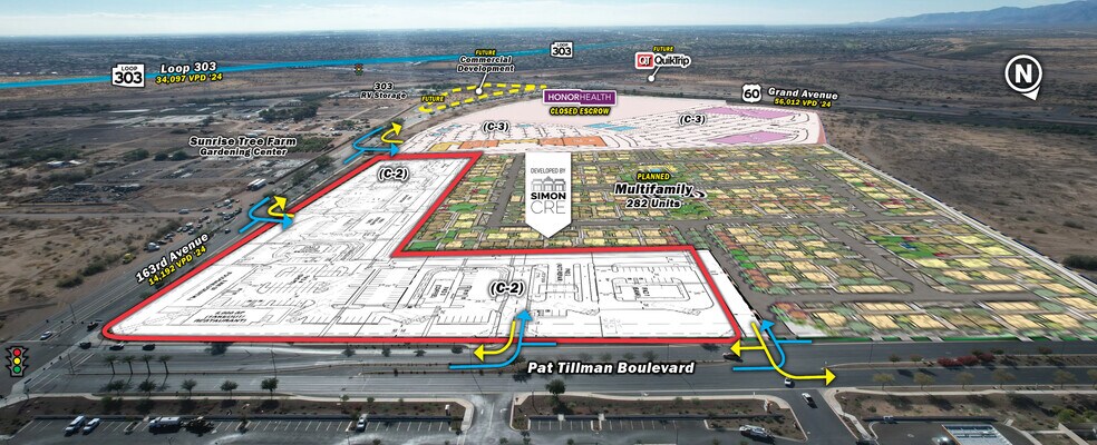 - Zoned C-2 (15 AC) and C-3 (30 AC), City of Surprise - Mixed-use project consisting of retail, commercial, hospital/medical office, and approximately 282 rental cottage homes - Across from brand new Fry's Marketplace - Convenient access to Grand Ave, 163rd Ave, Pat Tillman Blvd, and Loop 303 - Adjacent to Asante master-planned community with over 15,665 planned housing units