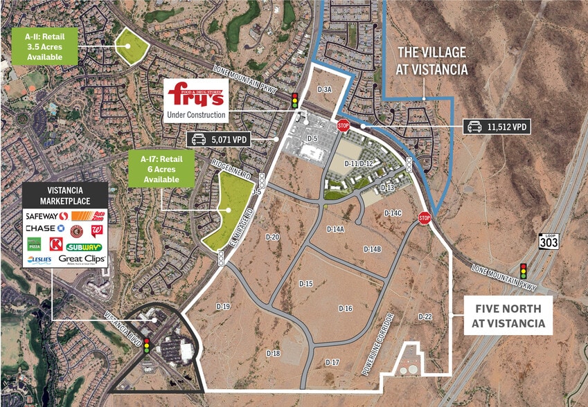 Le lot A-17 se trouve directement en face de Five North Vistancia et s'étend sur 6 acres le long du chemin El Mirage. Le site est facilement accessible aux résidents de tout le marché de Phénix. Accès facile à la boucle 303 nouvellement achevée avec un nombre de trafic quotidien projeté de 85 000 VPH et des liaisons vers l'I-17, l'US-60 et la boucle 101. Zone commerciale aisée affichant un revenu moyen des ménages de 160 000$ et plus dans un rayon de trois milles