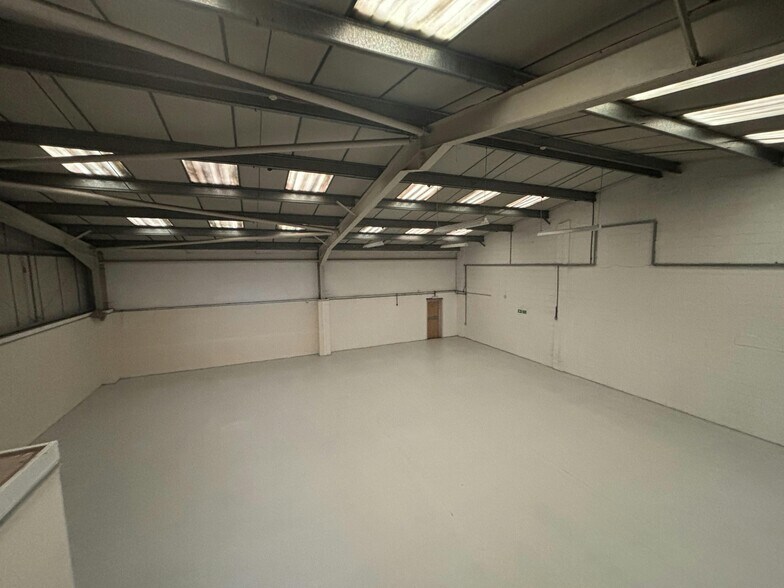 Unit 22 comprises an end-of-terrace industrial unit of steel portal frame construction with brick elevations, surmounted by a clad roof incorporating translucent roof panels. Internally, the unit provides an open-plan warehouse including a concrete floor, lighting, and an eaves height of approximately 4.1 m, rising to an apex of 5.8 m. Access is provided via a manual roller shutter door measuring approximately 3m (W) x 3.5m (H) to the front elevation. The accommodation also includes a ground floor office, accessed via a separate pedestrian entrance, along with kitchen and WC facilities. Externally, the unit benefits from dedicated car parking and loading apron to the front of the unit.