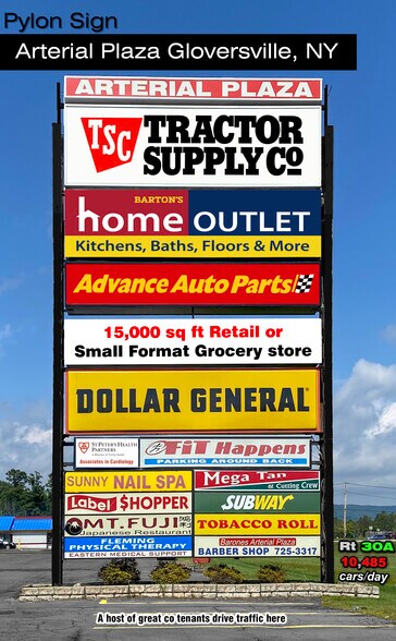 Arterial Plaza, Gloversville, NY 12078, entre Fifth Ave et Second Avenue, feux de circulation sur NYS Rt 30A, domicile de Tractor Supply Co, Barton Home Outlet, Advance Auto Parts, Burger King, Subway, Label Shopper, Mt Fuji Chinese Restaurant, Barbershop, Tabac Shop, Chiropraticien, Physiothérapeute, Gym and Cafe (Fit Happens) et plus encore, près de la Banque NBT avec des dépôts en chaîne et Pizza Hut, en face des Hannaford and the Runnings, McDonald's, House of Pizza et Dunkin Donuts