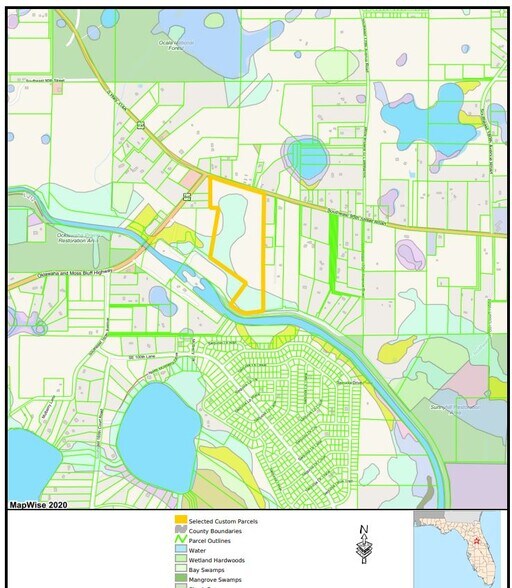 Fronte la rivière Ocklawaha et le sentier de la zone de restauration de Sunnyhill. Environ 1 200 pieds de façade sur le côté sud du chemin de la 95e rue Sud-Est. La propriété est d'environ 2 600 pieds du nord au sud. Peut être subdivisé en 5 5 sites d'habitation de 10 acres. De beaux feuillus !