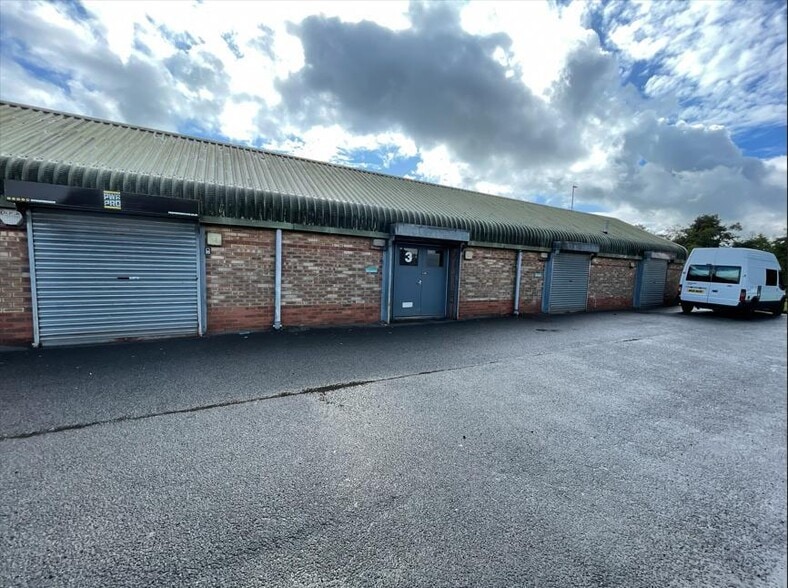 Le sujet comprend un local industriel de construction en briques avec un toit en tôle profilée. Il y a des places de stationnement directement en face de l'immeuble.