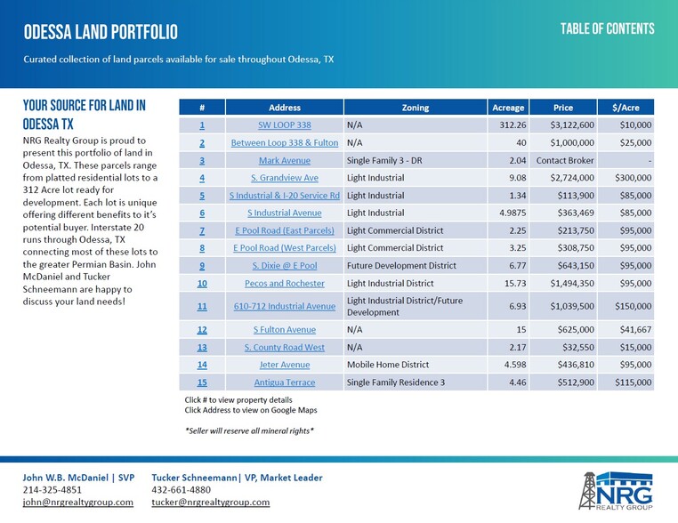 NRG Realty Group est fier de présenter ce portefeuille de terrains à Odessa, TX. Ces parcelles vont de lots résidentiels individuels à un terrain de 312 acres prêt pour le développement. Chaque lot est unique et offre différents avantages à son acheteur potentiel. L'Interstate 20 traverse Odessa, TX, reliant la plupart de ces terrains au vaste bassin permien. John McDaniel et Tucker Schneemann seront ravis de discuter de vos besoins en matière de terrains ! Cette parcelle comprend 1,34 acre de terrain zoné industriel léger. Sa forme est rectangulaire et elle bénéficie d’un bon accès. La parcelle est située à l’angle de l’Interstate 20 et de l’avenue Industrial.