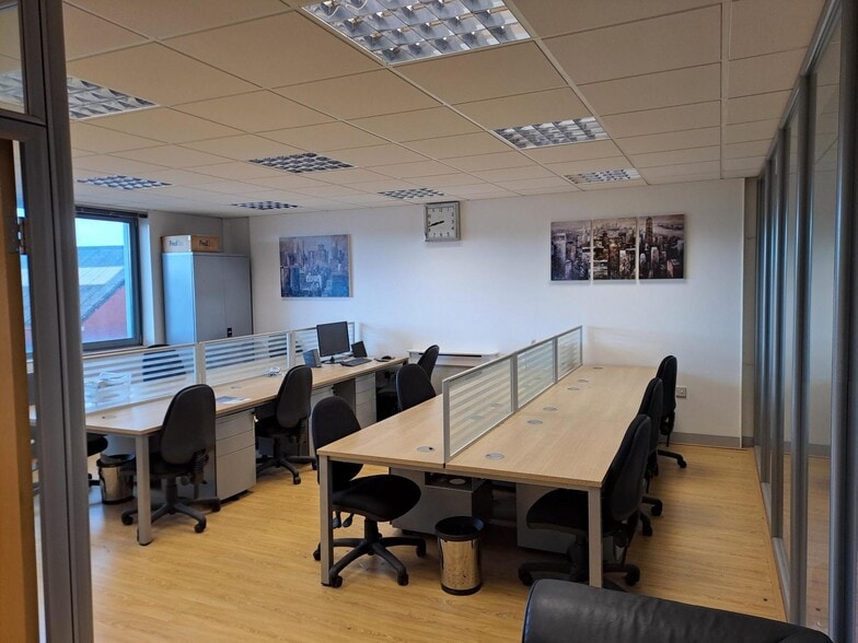 An end-of-terrace unit constructed in 2007, providing warehouse/production space at ground floor level together with high-quality, fully fitted first floor offices. The main warehouse area offers clear headroom ranging from approximately 7m to 8m and benefits from an electronically operated loading door measuring approximately 3.5m wide by 4m high. A Dexion racking system is installed and can be included within the letting if required. There is also a fitted kitchen area within the warehouse space. A staircase at the front of the property leads to the first floor, which provides an open plan office suite that has been finished to a high standard. Features include wood laminate flooring, a private office/meeting room, central heating, and a suspended ceiling with recessed lighting. The accommodation also includes a range of office furniture, allowing for immediate occupation.