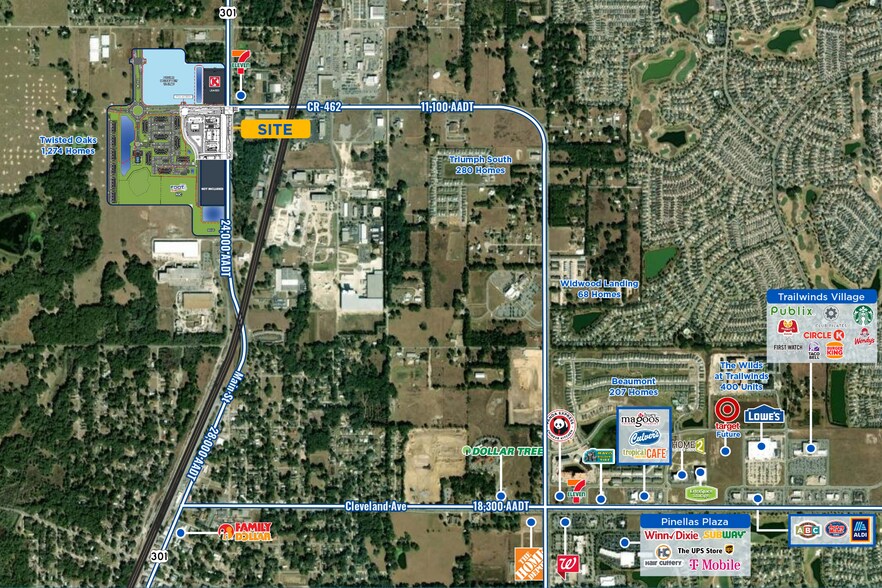 Positioned at the signalized intersection of US-301 and CR-462, the Shops at Twisted Oak offers a rare opportunity to lease or purchase prime retail space in one of Wildwood’s fastest-growing corridors. This high-visibility site is surrounded by over 5,800 new homes across 11 residential developments, including Twisted Oaks, Triumph South, and The Wilds at Trailwinds. With traffic counts exceeding 24,000 AADT on US-301 and 11,100 AADT on CR-462, the property benefits from exceptional exposure and accessibility. The site includes multiple pad and retail opportunities, with flexible configurations for QSR, automotive service, daycare, and traditional retail. Full access to US-301 at a traffic signal enhances ingress and egress, while proximity to national retailers such as Publix, ALDI, Lowe’s, and Home Depot ensures strong co-tenancy and consumer draw. Build-to-suit and ground lease options are available, making this an ideal location for expanding brands seeking a foothold in the Villages trade area. Demographics within a 5-mile radius include over 77,000 residents and a median household income of $82,880, with daytime population reaching nearly 87,000. The property is supported by robust infrastructure and is surrounded by a vibrant mix of residential, retail, and service-oriented development.