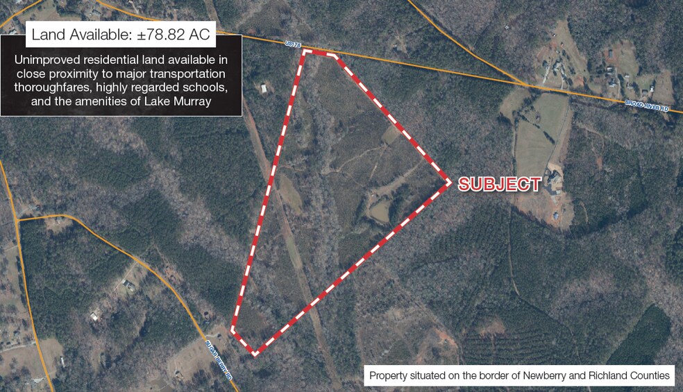 Positioned along US Highway 176 in Little Mountain, South Carolina, this ±78.82-acre tract offers a rare opportunity for residential development in a highly desirable corridor. The property benefits from exceptional connectivity, with immediate access to Broad River Road, Chapin Road, and Interstate 26, ensuring seamless travel to Columbia and surrounding markets. Its location on the border of Newberry and Richland Counties places it within reach of top-rated schools in Lexington/Richland School District Five, making it an attractive choice for family-oriented communities. The land features favorable topography and a serene setting near Lake Murray, a regional destination for recreation and lifestyle amenities. With zoning classifications of HM in Richland County and R-2 in Newberry County, the site supports a range of residential development options. Nearby traffic counts of approximately 48,200 vehicles per day along Broad River Road underscore strong visibility and accessibility for future residents. Demographic trends within a 15-minute radius reveal a growing population projected to exceed 32,700 by 2030, with average household incomes approaching $148,000—an indicator of strong purchasing power and demand for quality housing. This combination of strategic location, robust demographics, and proximity to major thoroughfares positions the property as a premier development site in the Midlands region.