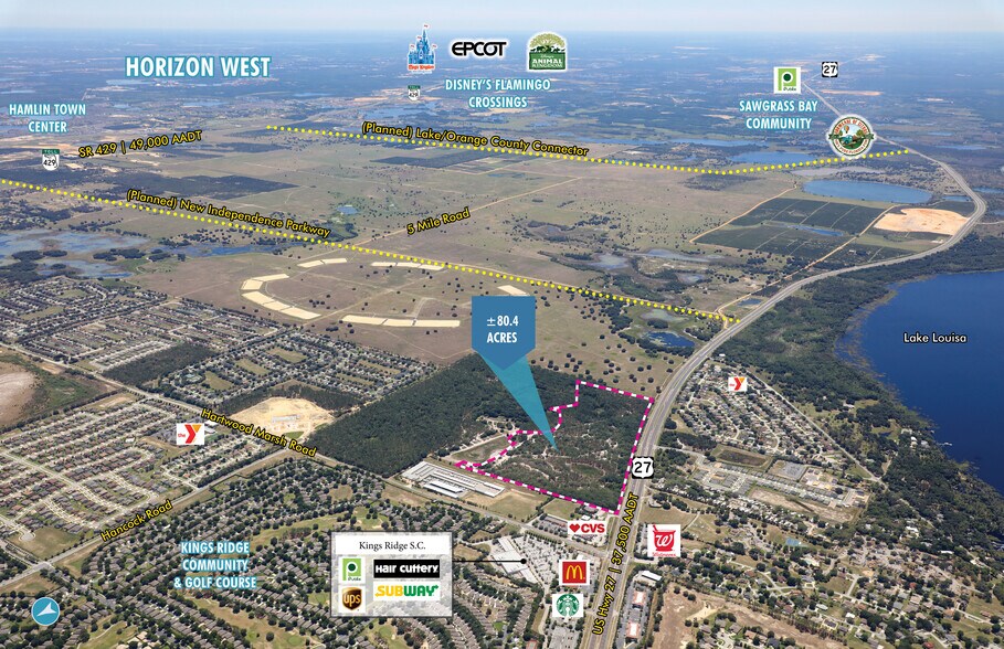 Cette possibilité de développement unique est située à Clermont, en Floride, sur la route 27 américaine, à l'intersection de Hartwood Marsh Road. Avec une façade de plus de 2 500 pi, le site est facilement accessible à la SR 50, au Florida Turnpike et à trois routes approuvées reliant la route américaine 27 à la SR 429. La promenade New Independence reliera le 27 américain à seulement 1 mille au sud de la propriété et fournira un accès direct au SR429 et au centre de la ville Horizon West Hamlin. Hamlin est le troisième projet de développement planifié en plein essor aux États-Unis. Le Lake/Orange County Connector est situé à 2 milles au sud de la propriété et fournira un accès facile au SR 429, Walt Disney World, Universal Studios et Downtown Orlando. La propriété est idéalement située à côté de Publix, Walgreens, CVS et McDonald's, et à proximité d'un supercentre Walmart, Aldi, JCPenney et World of Beer. Le PUD entièrement approuvé pour usage commercial et résidentiel offre une excellente occasion d'investissement ou de développement futur.