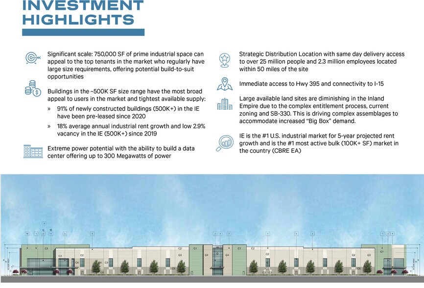 - 750,000 SF of prime ind. space can appeal to the top tenants who regularly have large size requirements, offering potential BTS opportunities