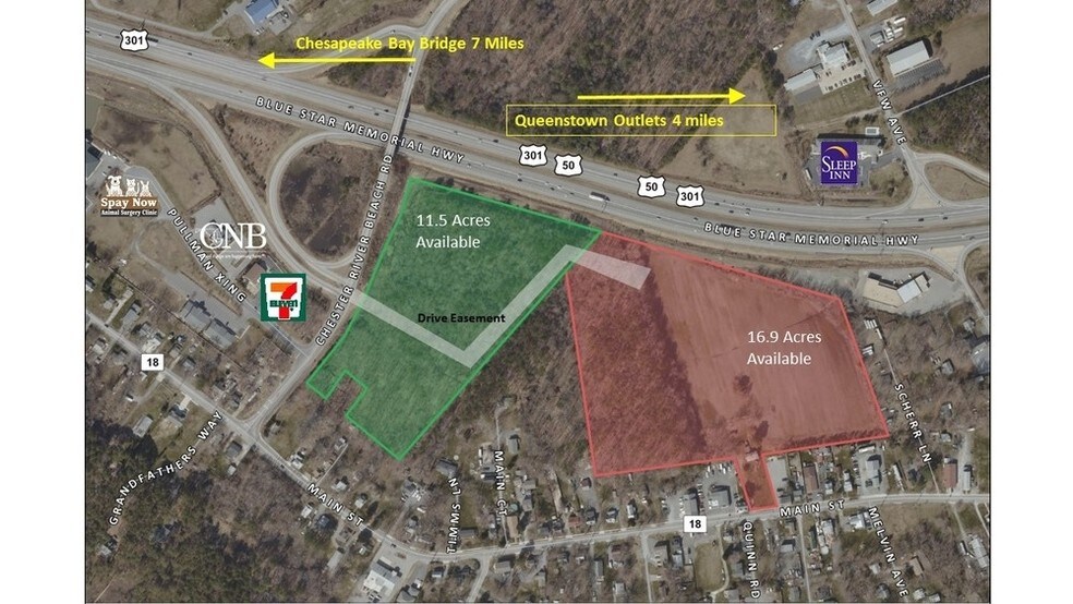 La plus grande parcelle de développement disponible le long des routes américaines 50-301 dans la région de l'île Kent. Situé à une distance de navettage facile de Baltimore, Washington et Annapolis, et à moins de trois heures de 40 % de la population du pays. Deux parcelles fiscales permettent l'utilisation de carrefours routiers ainsi que des scénarios d'aménagement à usage mixte du centre-ville.