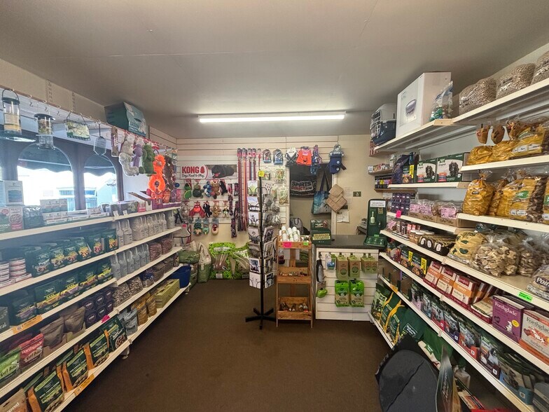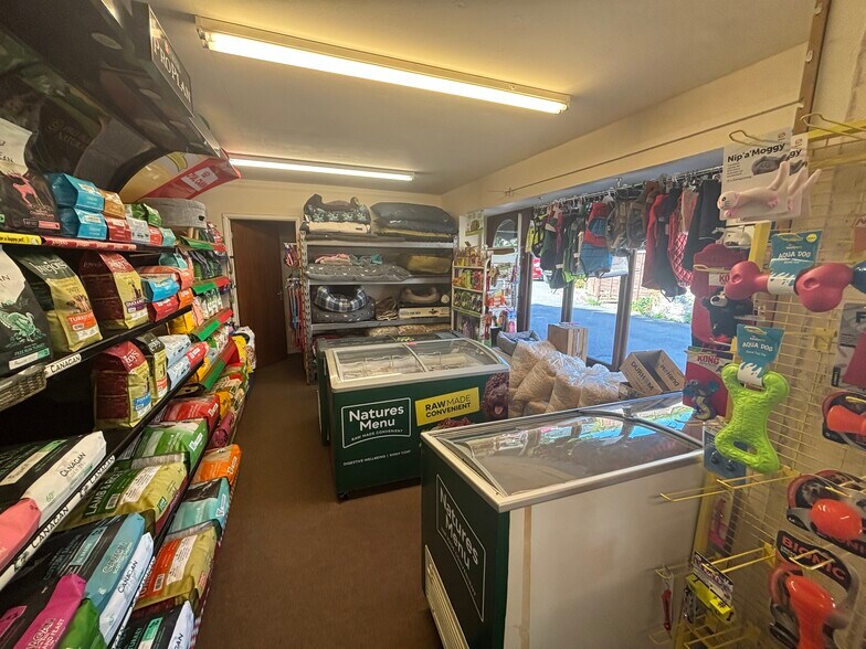 A well-presented, single-storey retail unit currently occupied by The Pet Shop. The property includes a frontloading area and two staff parking spaces. The interior offers a spacious open-plan retail layout, suitable for a range of retail or service uses. Additional features include two small storage areas, a kitchenette, and a WC located at either end of the units.