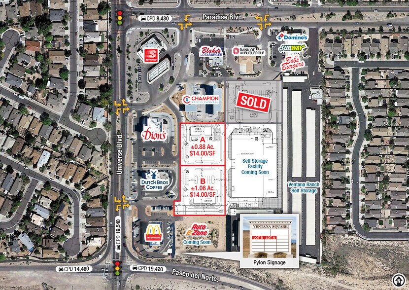 Positionné à une intersection clé et signalisée avec près de 49 000 voitures par jour Adjacent au Strip/Convenience Center, qui se classe parmi les 17 % les plus élevés à l'échelle nationale Région à forte croissance et à revenu élevé avec une demande pour le commerce de détail et les services Entouré de nouveaux commerces de détail tels que Dion's et Dutch Bros. Près de plusieurs écoles où la circulation des élèves est importante Pylône de signalisation disponible le long du Paseo del Norte Site de niveau prêt à être aménagé Tous les services publics sur le site