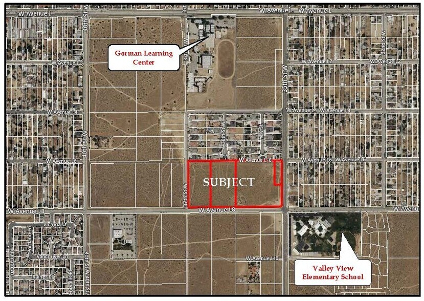 Coin nord-ouest de l'avenue W L-8 et de la 35e rue W; et coin nord-est de l'avenue W L-8 et de la 37e rue W, dans le secteur de Quartz Hill, dans la ville de Lancaster, CA 93536. Emplacement idéal avec des routes asphaltées sur trois côtés. Proche des commerces, parcs, écoles et bien plus encore! Précédemment approuvé (en 2006) sous le numéro de lotissement provisoire 061915 pour 33 lots résidentiels unifamiliaux. Rapport sur les ressources biologiques, rapport culturel, étude environnementale, rapport hydrologique, étude de phase I et étude des égouts de 2005/06 disponibles dans le cadre des enquêtes de diligence raisonnable de l'acheteur. Le plan est actuellement expiré.