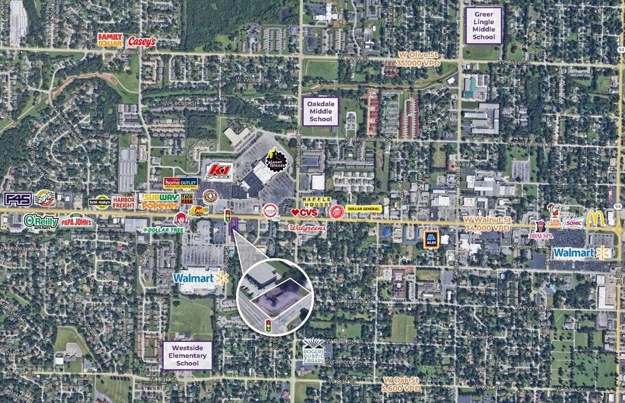 - Signalized Hard Corner: 0.61-acre site at the intersection of W Walnut Street (34,000 VPD) and S 21st Street in Rogers, AR