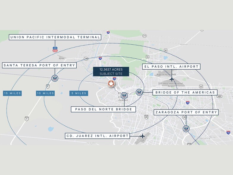 Acquire this strategically positioned ±12.3637-acre industrial land parcel in the Central/West El Paso Submarket. Its prime location offers exceptional access to I-10, Loop 375, and Border Highway 85, providing near-direct routes to the regions international ports of entry. Streamline your logistics with swift access to key border crossings, including the Paso del Norte (3.5 miles), Bridge of the Americas (6 miles), Zaragoza (15 miles), and the Santa Teresa International Port of Entry (18 miles) international bridges. Further enhancing connectivity, the site is conveniently located approximately 21 miles from the Union Pacific Intermodal Terminal and just 10 miles from El Paso International Airport. Situated in the heart of El Paso, this land offers a unique advantage by bordering both New Mexico and Mexico, making it ideal for businesses seeking seamless cross-border operations and unparalleled access to regional markets.