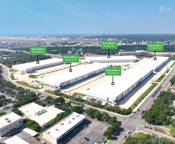 Le centre logistique Interpark au coin de l'avenue West et de la promenade Wurzbach établit la norme pour le développement d'entrepôts de classe A à San Antonio. Comme l'un des derniers sites intercalaires authentiques à San Antonio, Interpark est conçu stratégiquement pour les salles d'exposition et les entreprises de distribution. Avec une livraison prévue pour le troisième trimestre de 2023, ce centre comprend cinq bâtiments sur 45 acres avec jusqu'à 689 215 pieds carrés et huit points d'entrée au centre industriel. Interpark Logistics Center peut accueillir des places de stationnement lourdes avec 125 décrochages et un ratio de stationnement pouvant atteindre 1,57/1 000. Chaque immeuble sera doté d'immeubles de bureaux prêts à être emménagés, d'une aire de rassemblement de 60 pieds, de terrains pour camions de 130 pieds et d'un système de gicleurs ESFR. Les bâtiments varient de 119 600 à 155 475 pieds carrés avec une hauteur libre de 32 pieds, deux rampes d'accès et 24 à 40 portes de quai. L'autoroute 281 et la boucle 410 sont situées au centre à quelques minutes du centre industriel. Le centre logistique Interpark est incroyablement accessible, situé à quatre milles de l'aéroport international de San Antonio, à sept milles de l'Interstate 35 et à 12 milles du centre-ville de San Antonio. Entouré d'un important bassin de main-d'œuvre et d'une forte démographie, la population totale dans un rayon de cinq milles de la propriété est de 246 500 personnes, avec une augmentation annuelle prévue au cours des cinq prochaines années. Lorsque le développement industriel haut de gamme, la connectivité et la commodité sont essentiels, Interpark Logistics Center est la destination idéale.