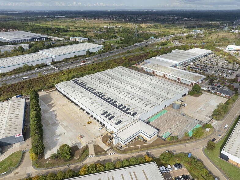 The property is available to let on a new Full Repairing and Insuring lease for a term to be agreed. Rent on application. The property comprises a substantial detached warehouse formed in 6 bays, featuring steel frame construction with part blockwork walls and external elevations of part brickwork and profile metal cladding. The warehouse is of a square shape with the main loading on the southern elevation consisting of 22 dock level doors approached by a gated entrance from Weston Avenue. · 22 docks to southern elevation, 6 docks/1 level access to eastern elevation and 1 level access to western elevation · 8.77m eaves height · Max 35m yard depth to front · Floor loading 37.5 kNm2 · Sprinkler system with external tank · Adjoining 2 storey offices· Generous car park There is a large concrete surfaced yard with a maximum depth of approximately 35.2m reducing slightly to the end section of approximately 32.4m and next to this is a landscaped triangular section which could be hard surfaced to improve the yard and parking facility. The eastern elevation features two storey offices and external areas used for staff car parking, with a further small, concreted yard providing access to additional loading doors comprising a single level door and 6 dock doors. Within this yard area is a large tank structure and associated pump house for the sprinkler system. To the north of the building is a yard used for further vehicle parking which has a depth of approximately 29.64m. The western elevation of the property facing the M25 has a narrow roadway capable of use by emergency vehicles and in the south west corner is a single surface level loading door. Internally, the building is fitted out with two levels of mezzanine floors used for garment storage. Access within the warehouse was limited due to the operational nature of the building and access was not provided to the office section.