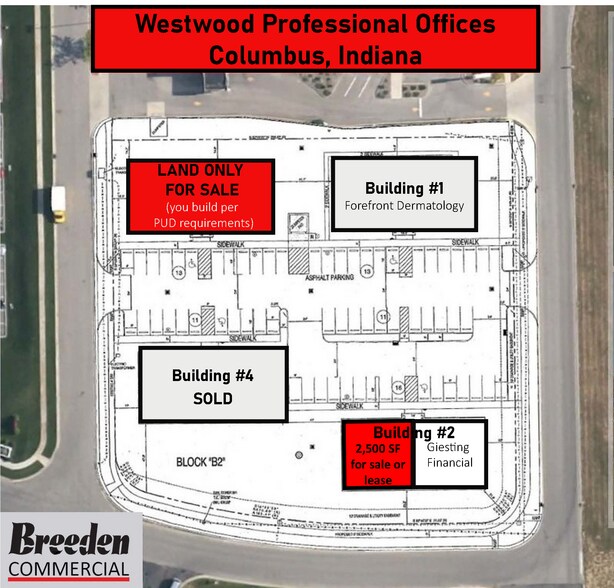 Les bureaux professionnels de Westwood seront constitués de 4 immeubles à bureaux professionnels, chacun de 5 000 pi2. Il y a de généreuses possibilités de stationnement partagé et de signalisation. Disponible à la vente est le coin nord-ouest du complexe (bâtiment 3 lot). Il est également disponible à la vente ou à la location en tant que construction pour convenir à un prix de vente négocié plus élevé. Les utilisateurs de bureaux médicaux ou professionnels profiteront de l'accès facile et de la proximité de I-65, SR 46 et de la population du côté ouest du comté de Colomb et de Bartholomew.