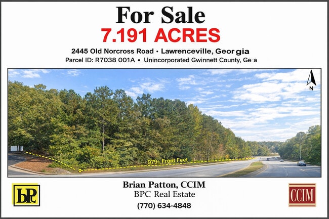 Offert à la vente est un site de développement commercial de 7,191± acres situé au 2445 Old Norcross Road dans le comté non incorporé de Gwinnett, en Géorgie, à environ 2,9 miles à l'est du Gwinnett Place Mall via Satellite Boulevard. La propriété dispose d'environ 979± pieds de façade sur la route, d'une visibilité exceptionnelle et d'un zonage C-4 Major Strip, permettant une large gamme d'utilisations commerciales et de détail.