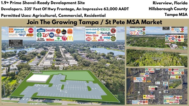 Préparez votre pelle pour développer ce site de choix dans la région métropolitaine de Tampa/St. Pete. Ce terrain de 1,97 acre offre une combinaison exceptionnelle de visibilité, d'accès et de potentiel de développement dans le marché en pleine expansion de Riverview. Avec 335 pieds de façade sur l'US Highway 301, une route à fort trafic (63 000 véhicules par jour), et une profondeur de 285 pieds, ce site est idéal pour une large gamme d'usages futurs. Actuellement zoné ASC-1 (Agricole – Résidentiel unifamilial conventionnel, 1 unité/acre), il se trouve dans un corridor de transition entouré de développements commerciaux et à usage mixte établis, offrant un fort potentiel de rezonage en Commercial Général (CG), Développement Planifié (PD) ou usage mixte. La désignation Zone X pour les inondations indique un risque minimal d'inondation, éliminant ainsi le besoin d'une assurance coûteuse, et les services municipaux d'eau et d'égout sont disponibles dans la rue pour soutenir un développement à plus forte intensité.