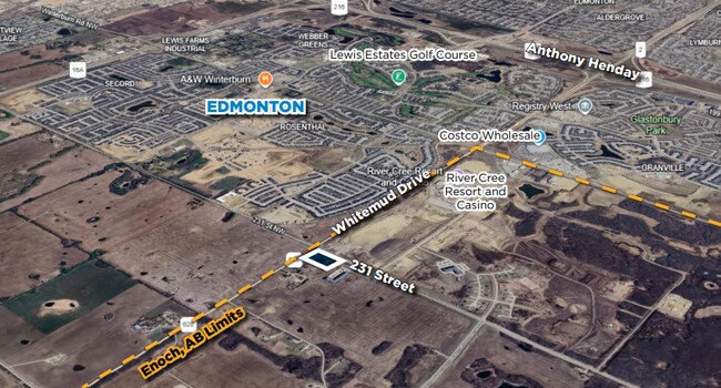 Cette propriété est un grand site de développement commercial d'angle disponible à la vente en tant qu'intérêt de bail, situé à l'angle sud-ouest de la 231e Rue et de Whitemud Drive à Enoch, Alberta, près des limites de la ville d'Edmonton. Le site offre environ sept acres de terrain commercial à usage mixte avec des services d'eau et d'égouts municipaux. Il bénéficie d'une grande visibilité sur Whitemud Drive et la 231e Rue et est adjacent à des commodités majeures telles que le River Cree Resort and Casino, Costco Wholesale et le Lewis Estates Golf Course.