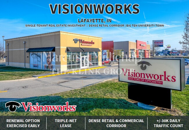 The Klink Group of Marcus & Millichap is pleased to exclusively present for sale the Visionworks property located in Lafayette, Indiana. The subject offering is a single-tenant, net-leased retail asset positioned along Sagamore Parkway, one of Lafayette’s most heavily trafficked retail and commercial corridors, with approximately 30,000 vehicles-per-day. Originally constructed in 2016 as a build-to-suit for Visionworks, the property is situated on 0.48 acres at the signalized-intersection of Sagamore Parkway South and Teal Road. The site benefits from exceptional visibility and access and is directly adjacent to Tippecanoe Mall, a dominant regional indoor mall owned and operated by Simon Property Group. Visionworks recently exercised its first five-year renewal option early, demonstrating strong commitment to the location. The lease features three remaining five-year renewal options, each with 10 percent rental increases, providing investors with long-term income growth and stability. The tenant operates under a triple-net (NNN) lease structure, reimbursing the landlord for common area maintenance, property taxes, and insurance, while the landlord collects a 15 percent CAM administrative fee. This offering represents an ideal opportunity for passive investors seeking high-quality, net-leased real estate in a dense and established retail corridor, anchored by a national tenant with proven site commitment and built-in rental escalations.