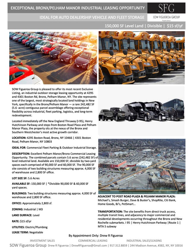 SOW Figueroa Group is pleased to offer its most recent Exclusive Listing, an industrial outdoor storage leasing opportunity at 4295 Boston Rd, Bronx, 10466 and 4301 Boston Rd, Pelham Manor, NY 10803. The site represents one of the largest, most strategically located land holdings in New York, specifically in the Bronx/Pelham Manor — a rare 242,482 SF (5.6 -acre) contiguous parcel assemblage offering exceptional flexibility across industrial, fleet parking, logistics, and long-term redevelopment.